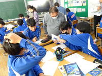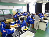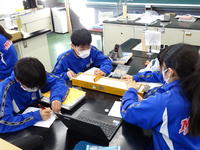 1年理科「弦の振動による音の大きさと高さ」の授業の様子です。音の大きさと高さにはどのような関係があるかを調べました