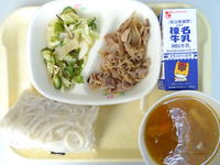 今日の給食は、バックうどん、牛乳、うどん汁、肉うどん具、塩昆布和えです。