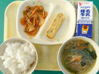 今日の給食は、ご飯、牛乳、春雨スープ、キムタクごはんの具、きんぴら卵焼きです。
