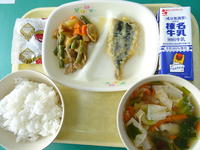 今日の給食は、ごはん、牛乳、すまし汁、肉じゃが、いわしの天ぷら甘酢あんかけ、黒糖副豆です。