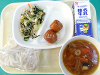 今日の給食は、パックうどん、牛乳、五目あんかけうどん汁磯香和え、甘酢肉団子です。