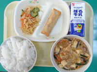 今日の給食は、ご飯、牛乳、麻婆豆腐、もやしのラー油漬、春巻きです。