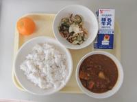 今日の給食は、麦ごはん、牛乳 、秋野菜カレー、かつおぶしサラダ、みかんです。