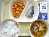 今日の給食は、ご飯、牛乳、けんちん汁、さばのみそ煮、にんじんしりしりです。