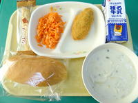 今日の給食は、コッペパン、牛乳、ラビオリクリーム煮、キャロットラペ、白身魚のバジルソースフライ、チョコクレープです。