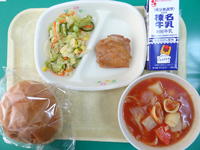 今日の給食は、丸バン、牛乳、ミネストローネ、枝豆サラダ、鶏の照り焼きです。