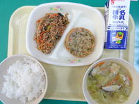 今日の給食は、ご飯、牛乳、トッポギスープ、ビビンバの具、チヂミです。