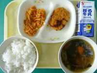 今日の給食は、ごはん、牛乳 、お富ちゃんスープ、切干大根のナポリタン、コロッケです。