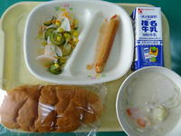 今日の給食は、ゆめロール、牛乳 、白菜のクリームシチュー、水菜と大根のサラダ、ウインナーケチャップソースです。