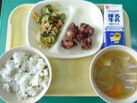 今日の給食は、さくらごはん、牛乳 、呉汁、海そうサラダ、いかのキャベツ揚げです。