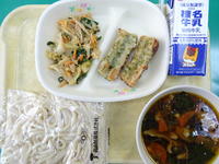 今日の給食は、パックうどん、牛乳 、きのこうどん汁、にらのごま和え、ちくわの磯辺揚げです。