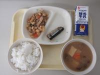 今日の給食は、ごはん、牛乳 、なめこと厚揚げのみそ汁、五目煮、さんまのみぞれ煮です。