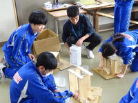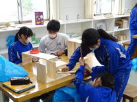 1年技術「木材加工」の授業の様子です。素地の調整をして塗装を行いました。