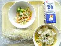 今日の給食は、パックラーメン、牛乳 、塩ラーメンスープ、じゃことつぼ漬けのバリバリ和え、厚焼きたまごです。