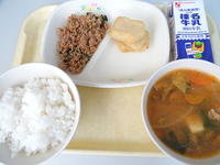 今日の給食は、ご飯、牛乳、けんちん汁、さばのみそ煮、にんじんしりしりです。