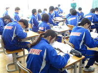 3年生の数学の授業では、入試や総仕上げに向けて演習問題に取り組んでいます。 一人ひとりが「一問でも多くの問題を解こう」という意欲を持ち、応用問題にも積極的にチャレンジしました。また、解き方に迷ったときは生徒同士で自然に教え合う姿が見られ、クラス全体で学力を高め合っています。