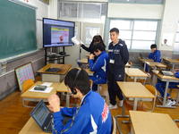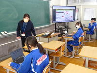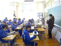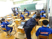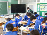 3年生の3校時は理科でした。自然環境と人の関わりをテーマに、ICTを活用したクイズ形式の問題に挑戦しました。「雨が降ると、山地ではどのようなことが起きるのか?」「堤防は何のためにあるのかの?」など、早押しの選択式だったので、各自集中し、自分のタブレットで回答しました。