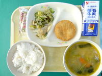 今日の給食は、ごはん、牛乳、野菜たっぷりバターみそスープ、こんぶサラダ、チーズハムカツ、味付けのりです。