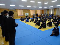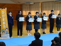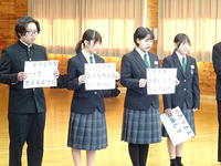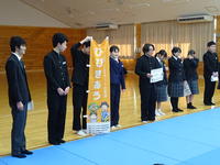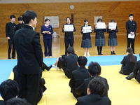 2月10日(火) 全校生徒が武道場に集まり、生徒会集会を実施しました。今回は報道委員会の生徒が中心となり、お昼の放送に関するお願いを伝えました。 また、甘楽富岡地区いじめ防止フォーラムの行動目標として採用された、本校生徒考案のスローガン「ひびきあう」についての説明も行われました。