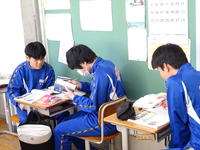 1年生の1校時は英語でした。「Let’s make original Folk Story」という課題で、「浦島太郎」「さるかに合戦」などの昔話のストーリーから、英文をつくる活動に取り組みました。「いつ、だれが、どこで、何のために」に着目して、意見交換をしながら、主語や動詞、接続詞など、文の組み立てを考えました。