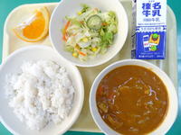 今日の給食は、麦ごはん、牛乳、富岡ボークのカレー、キャベツのサラダ、いよかんです。