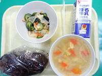 今日の給食は、ココア揚げパン、牛乳、チーズかきたまスープ、いかくんわかめサラダです。