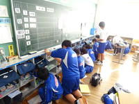 2年理科「気団と前線」の授業の様子です。前線が通過する前後の気象要素を資料から読み取り、関係について考えました。