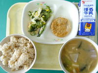 今日の給食は、さくらごはん、牛乳 、呉汁、海そうサラダ、いかのキャベツ揚げです。