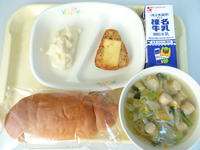 今日の給食は、桑の葉きなこ揚げパン、牛乳、にらワンタンスープ、コロコロチーズとツナのサラダです。