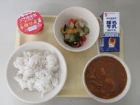 今日の給食は、麦ごはん、牛乳、富岡ポークのカレー、カラフルこんにゃくサラダ、ヨーグルトです。