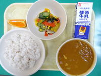 今日の給食は、麦ごはん、牛乳、チキンカレー、カラフルこんにゃくサラダ、清見オレンジです。