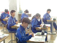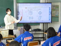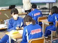 1時間目の2年生は技術科でした。「スイッチを切り替えるとLEDをつけたり消したりできるのはなぜか」というテーマで、タブレットの画面上で、電源やスイッチなどをつないで電気回路をつくるシュミレーションをしました。試行錯誤しながら何度も挑戦していました。