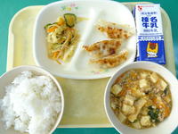 今日の給食は、ご飯、牛乳、マーボー豆腐、春雨サラダ、ぎょうざです。