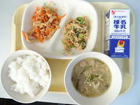 今日の給食は、ごはん、牛乳、ごぼうと卵のスープ、切干大根のごまみそ和え、こぎつねごはんの具です。