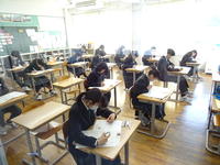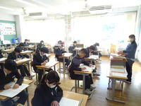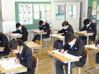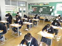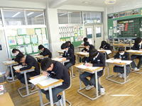 2月19日(木) 本日より、1・2年生を対象とした第3学期定期テストがスタートしました。初日は、英語・技術家庭科・国語・音楽の4教科が実施されています。静まり返った教室にペンを走らせる音だけが響き、一人ひとりがこれまでの学習の成果を存分に発揮しようと真剣に取り組んでいます。