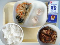 今日の給食は、ごはん、牛乳、なすと生揚げのみそ炒め、春雨とわかめのサラダ、えびしゅうまいです。