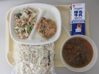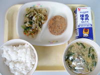 今日の給食は、ごはん、牛乳、にらたま汁、磯香和え、レバー入りメンチカツです。