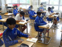 3年英語の授業の様子です。英語の文章のクイズに挑戦しました。