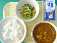 今日の給食は、ご飯、牛乳、チキンカレー、福神漬け和えです。
