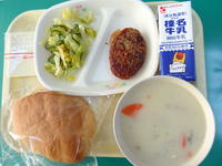 今日の給食は、パーカーハウス、牛乳、クラムチャウダー、フレンチサラダ、ハンバーグケチャップソース、スライスチーズです。